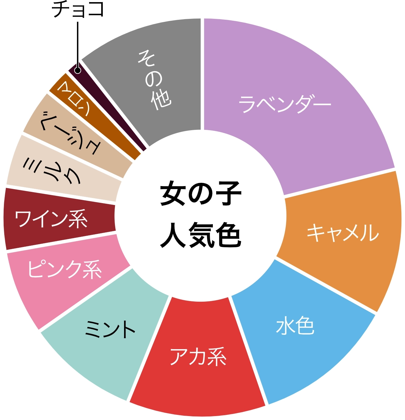 1番人気の色はラベンダー、2番人気はキャメル、水色系、アカ系、3位はミントとなっています。ただし、このグラフはすべてのモデルの色を合わせたデータなので、モデルごとの順位とは順番が少し異なります。