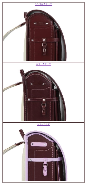 池田屋ランドセルでは、本体とステッチが同じ色の「シンプルステッチ」や、本体とステッチや一部の色が異なる「カラーステッチ」、本体とフチなどの色が違う「カラーコンビ」の3パターンから選べます。