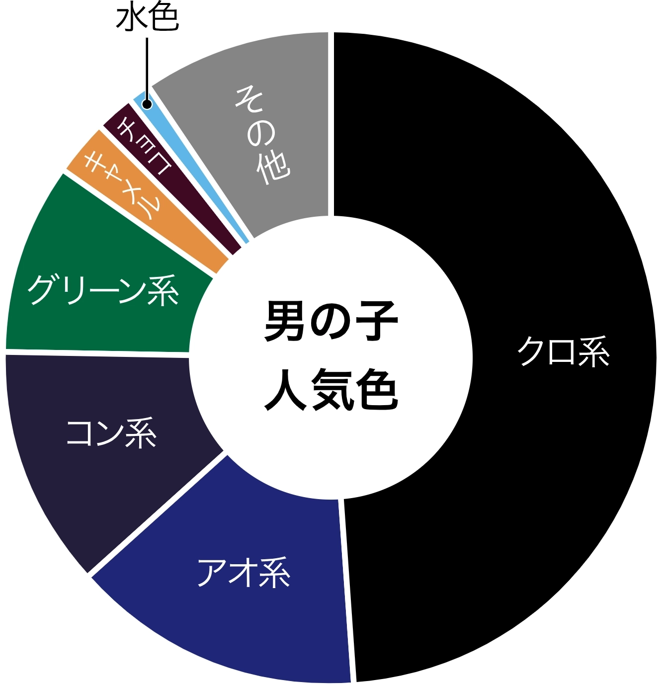 特に人気なのはクロ系で、2位はアオ系、3位はコン系です。ただし、このグラフはすべてのモデルの色を合わせたデータなので、モデルごとの順位とは順番が少し異なります。