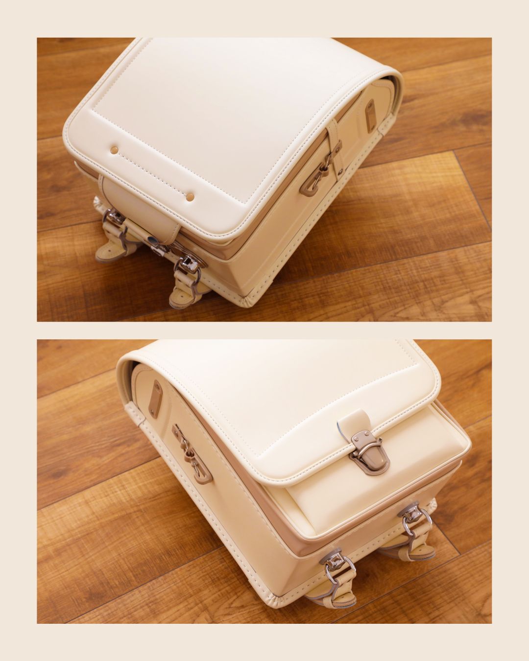 ふわっとやさしいまろやかなホワイトの本体にミルク色の小マチを合わせて、上品なイメージに仕上げました。